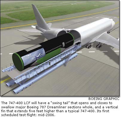 4架747超級運輸機的素材是來自中華航空、中國國際航空及馬來西亞航空,是因應要節省運送787夢幻客機機身的成本和時間而改造,改裝後的747-400運輸機載貨空間是一架普通747-400貨機的2.5倍之多,並在2006年起投入服務!
